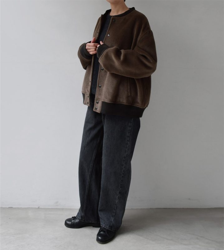 holk のバーシティジャケットと、CIOTA のバギーデニム。