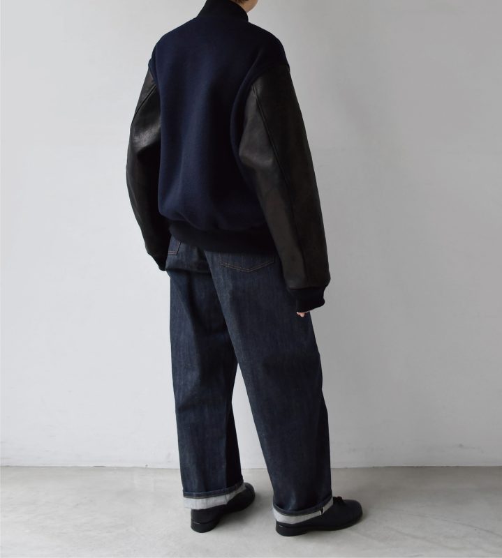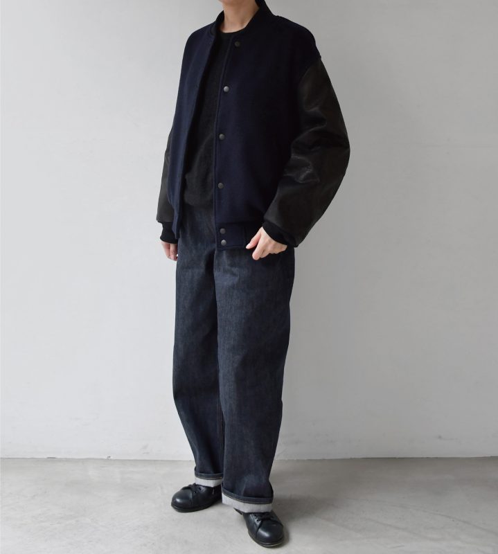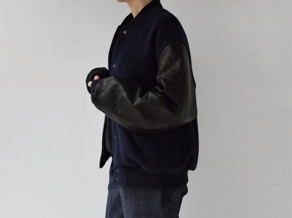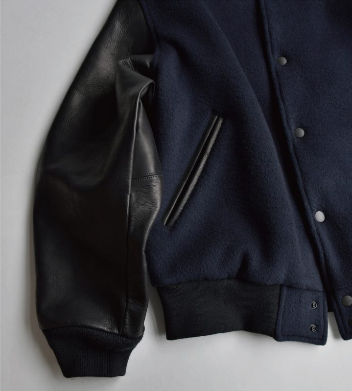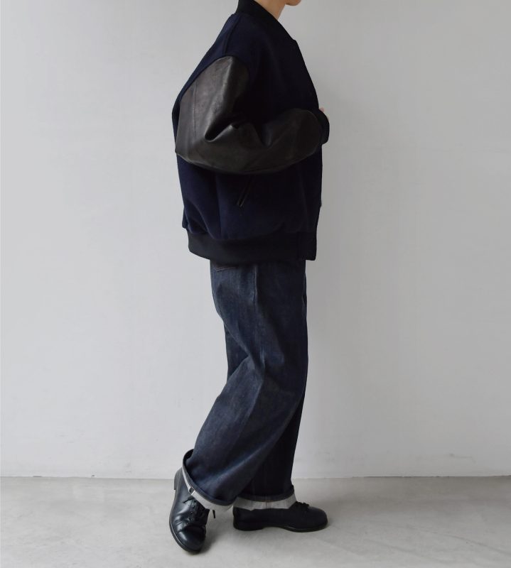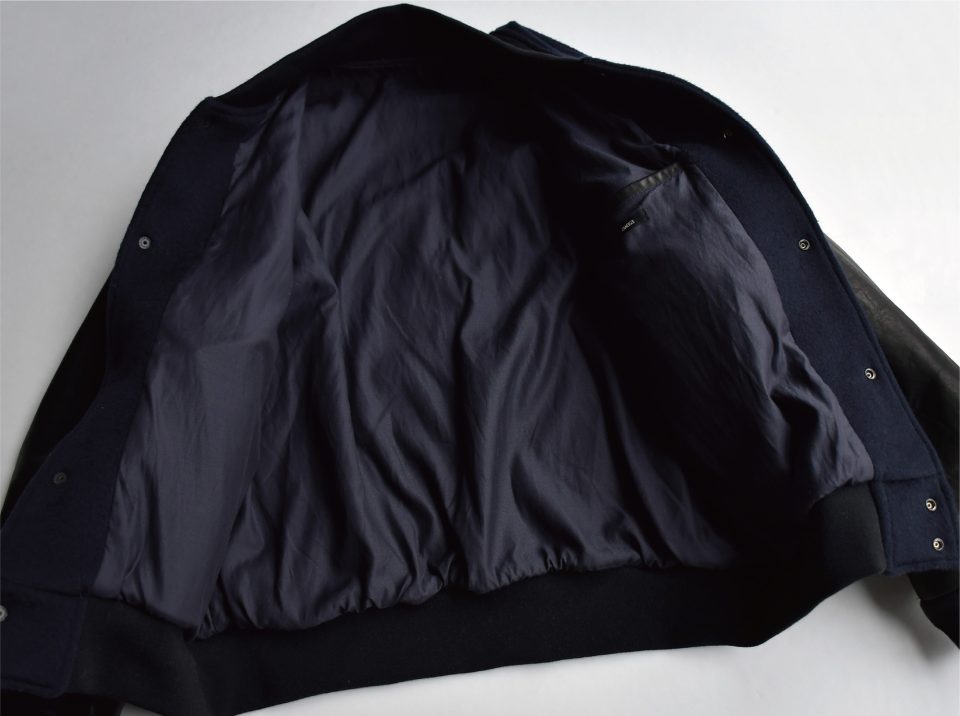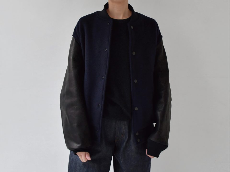 風合の良い上質な Super140‘s ダブルメルトンのボディに、袖はカウレザー。