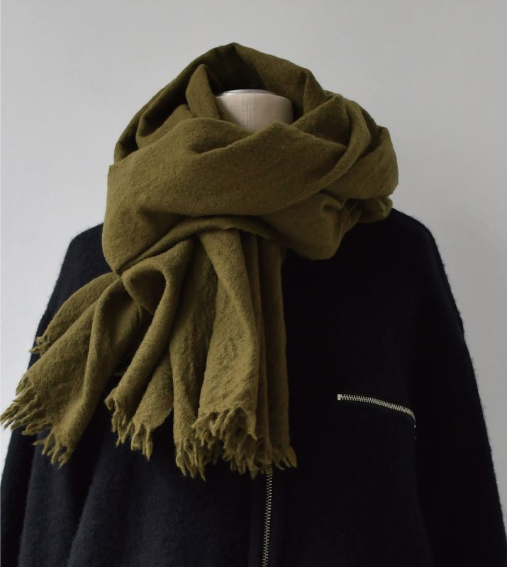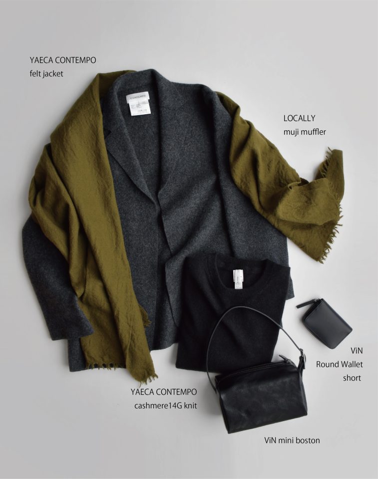 上質なウール。ふんわり身体を包んでくれるやわらかさ。先日ご紹介した ViN のミニボストンを合わせて。