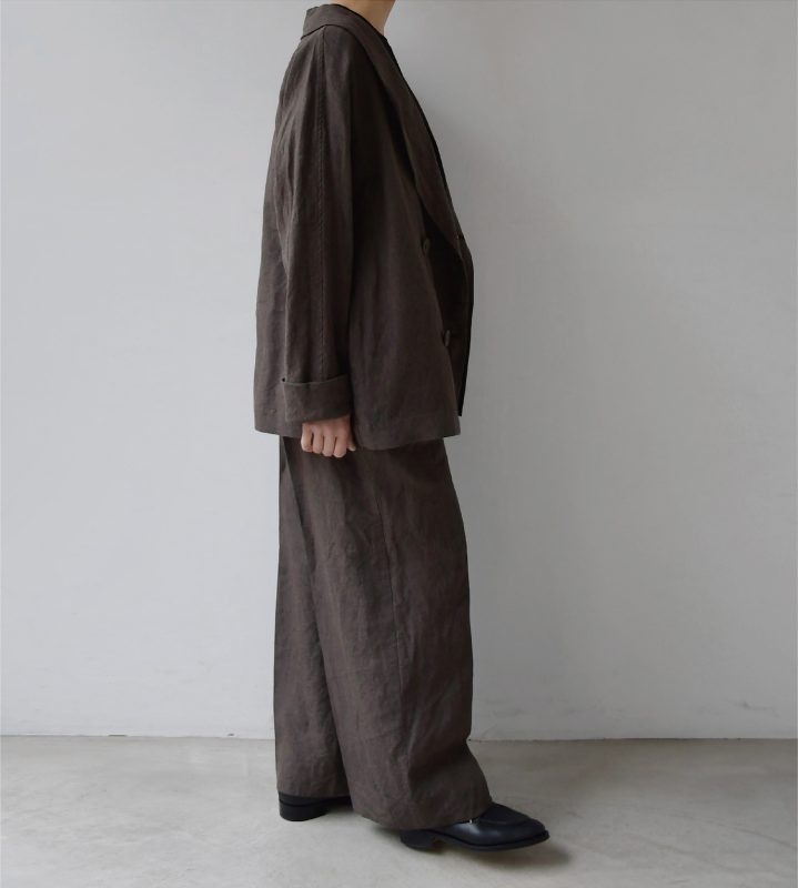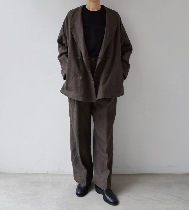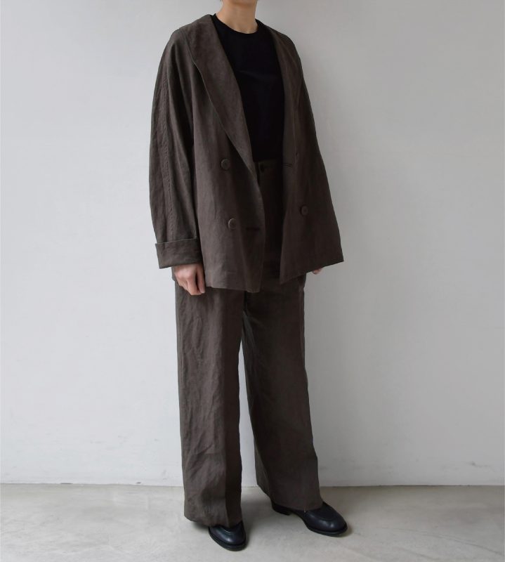 今日は(エシュペー)のリネン素材のショールカラージャケットとパンツをご紹介します。