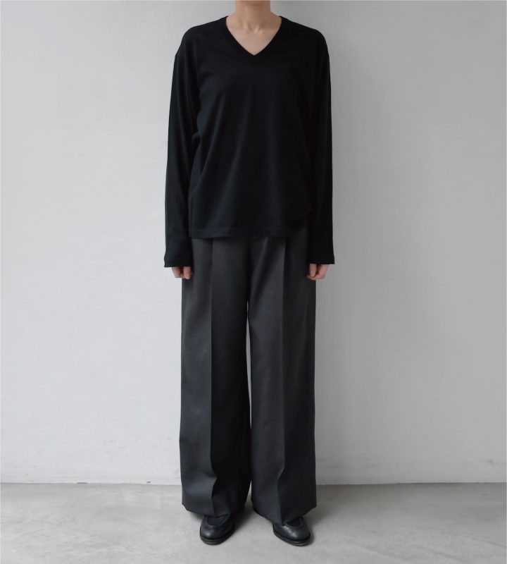きれいなVネックに、袖や裾はストンとしたラフなシルエット。